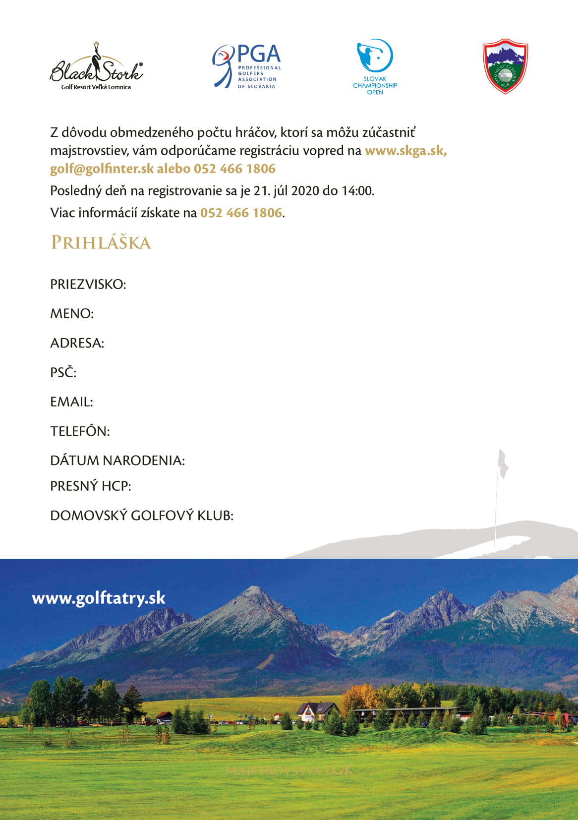 Prihlásiť sa na Majstrovstvá LGK môžete do 21. júla 2020 do 14:00 hod. na stránke www.skga.sk, alebo nás kontaktujte na golfrecepcia@golfinter.sk alebo 052 466 1806.Počet miest je obmedzený.