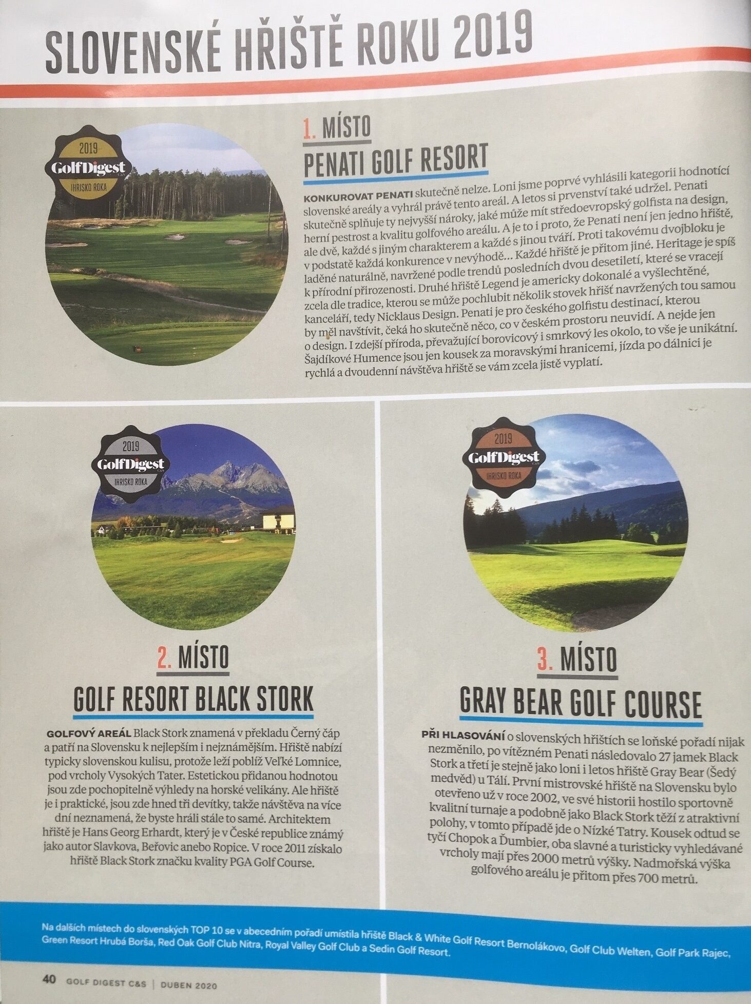 Golfový rezort Black Stork získal 2.miesto v čitateľskej Ankete magazínu Golf Digest C&S za rok 2019 2.miesto  v kategórii „Hřiště roka“!. Hlasovanie ankety prebiehalo na web stránke www.golfdigest.cz magazínu Golf Digest C&S v termíne od 15. októbra 2019 do 15. marca 2020. Vyhodnotených bolo rekordných 29 972 zaslaných a verifikovaných hlasov.  Anketa odráža mienku vás, golfistov a čitateľov časopisu.